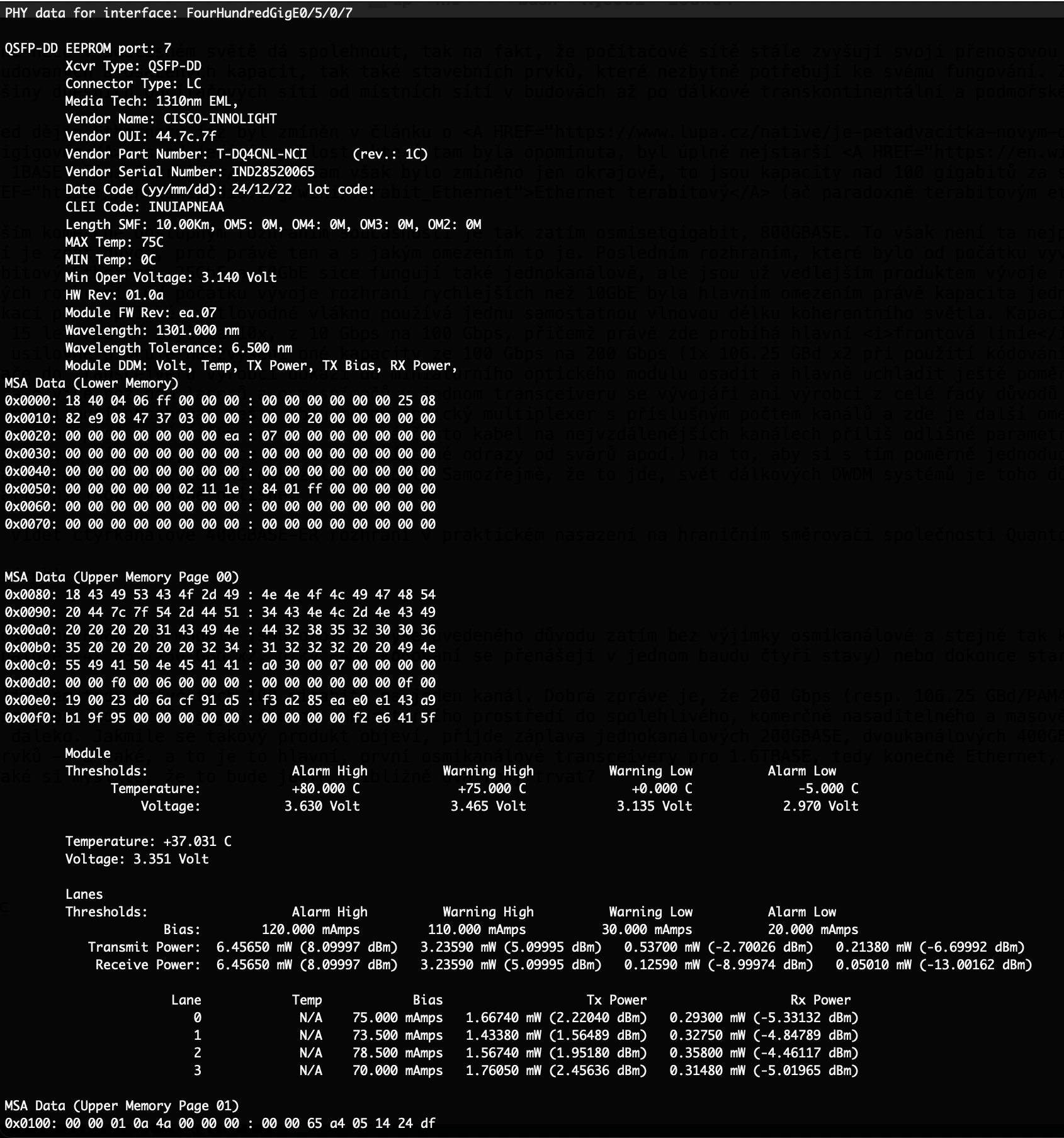 Zde můžete vidět čtyřkanálové 400GBASE-LR4 rozhraní v praktickém nasazení na páteřním směrovači společnosti Quantcom, a.s.: