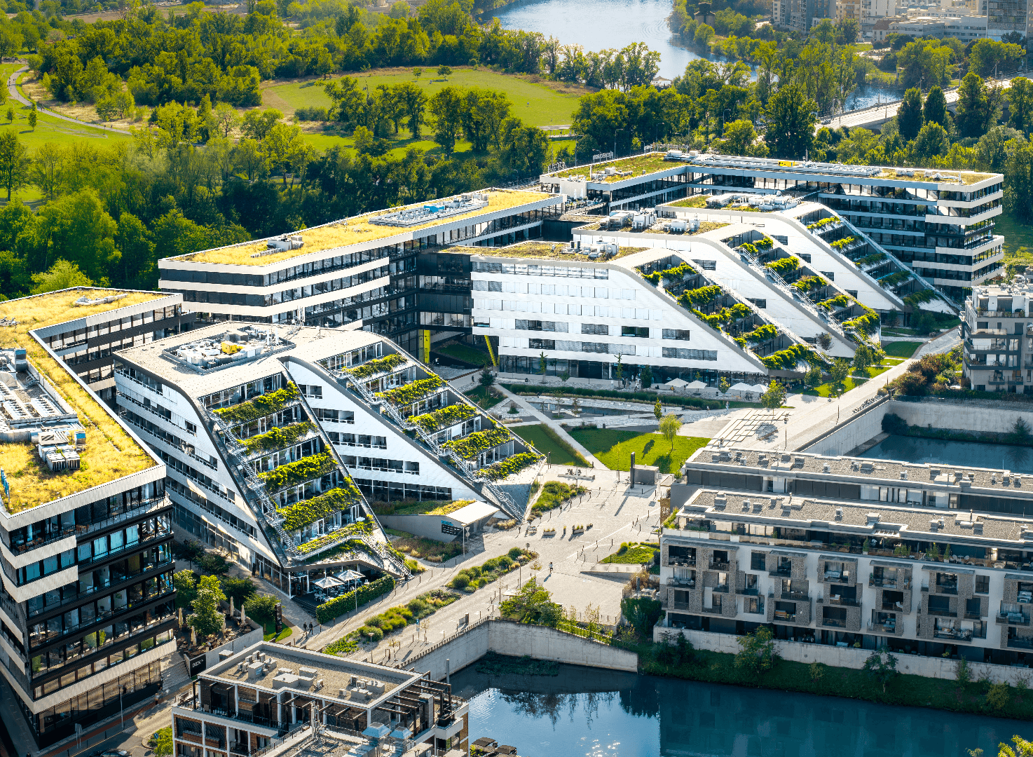 Architektonické řešení budov bylo navrženo s respektem k duchu místa. Kombinuje moderní materiály se zelení a vodními prvky, čímž vytváří harmonické prostředí pro život ve velkoměstě. Díky promyšlenému členění prostoru došlo k plynulému propojení soukromých a veřejných částí. Za výslednou podobou komplexu stojí renomovaná architektonická studia Ian Bryan Architects, QARTA Architektura a Schindler Seko architekti.